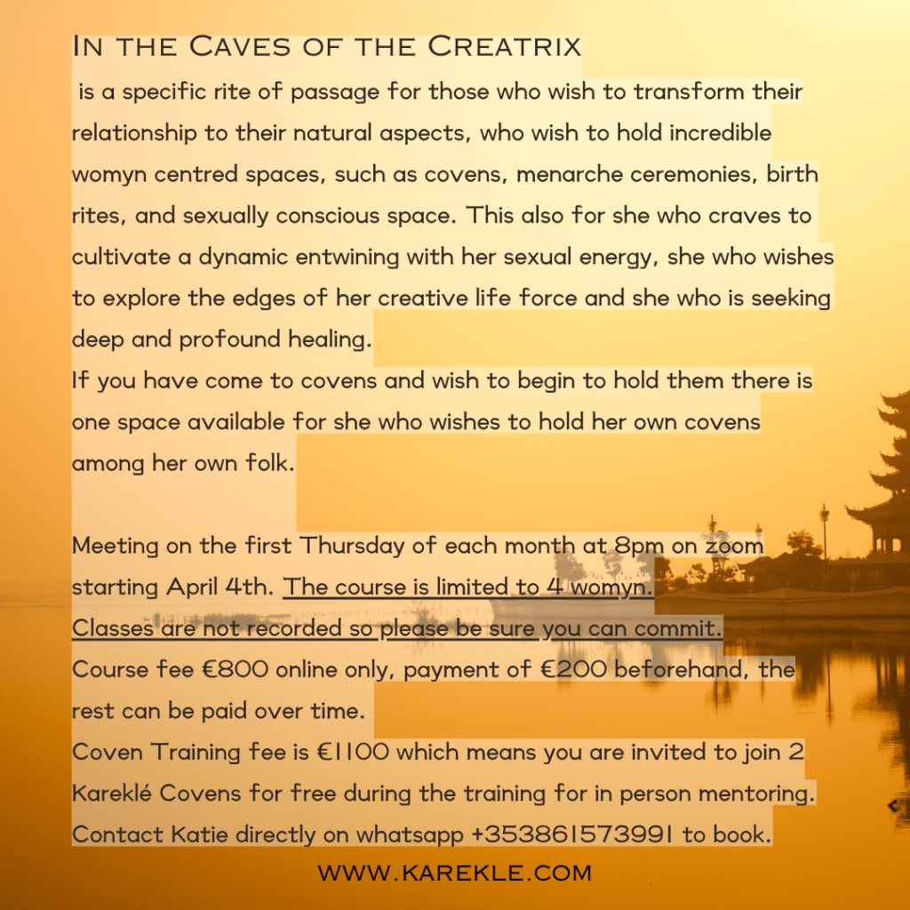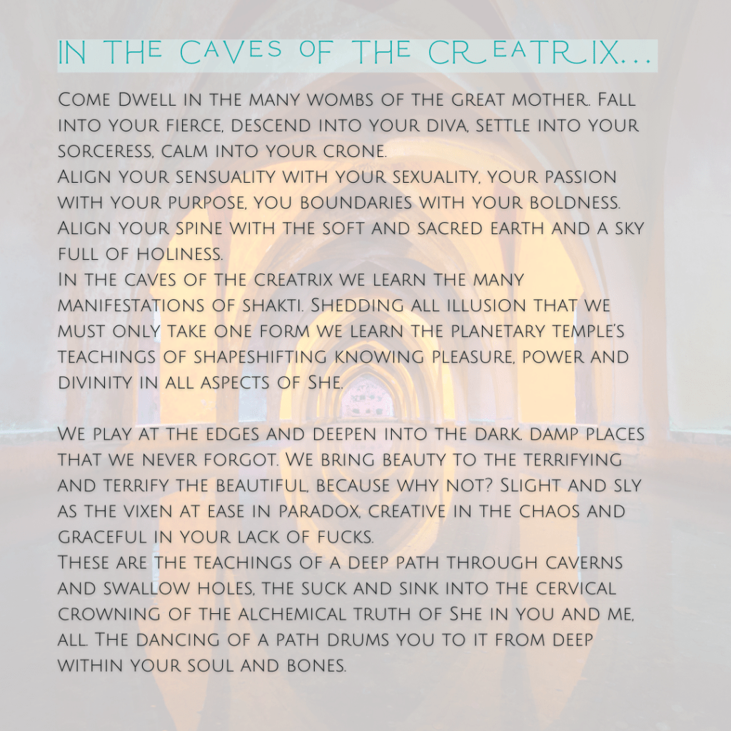 This is a path that has asked to be shared. We work deeply with symbols and simple yoga asana, colour and craft and story telling to wander our way through the many caves of the creatrix.
