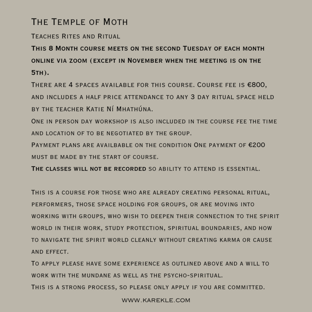 We are innately creatures of Ritual; conscious or unconscious. Every meal, every conversation, how we awaken, how we bathe, how we walk in the world has certain ritual attached to it. In the Temple of Moth teachings we bring consciousness to the rituals we perform and seek out the necessary rites in order to be able to perform rituals of greater harmony and reciprocity in the world.